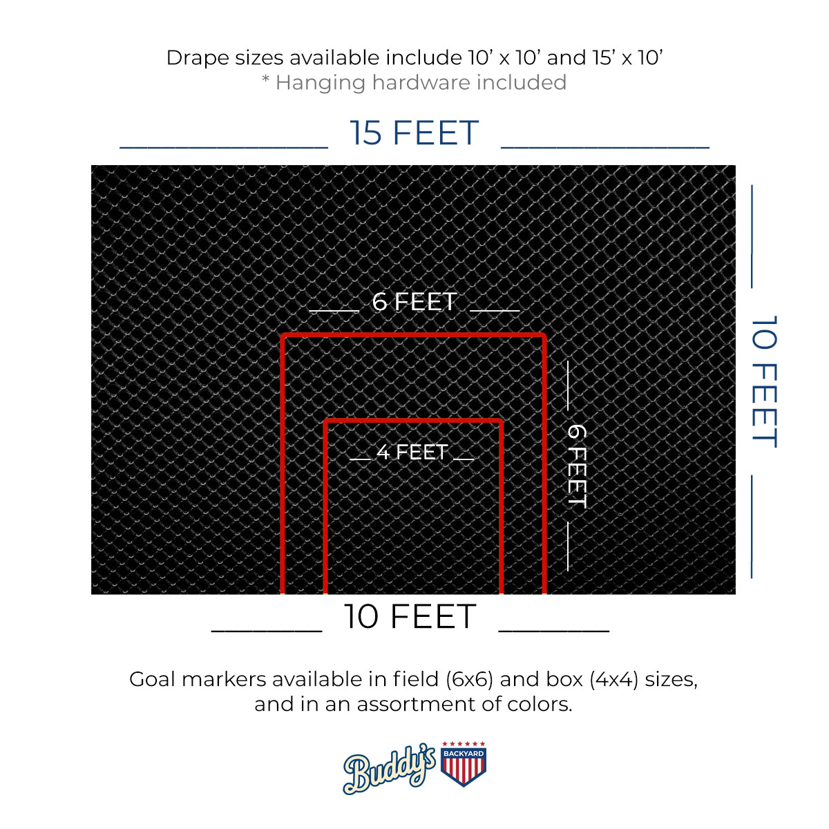 Heavy duty netting that measures 10 feet x 10 feet, with a standard 6×6 goal marked in the color of your choice.